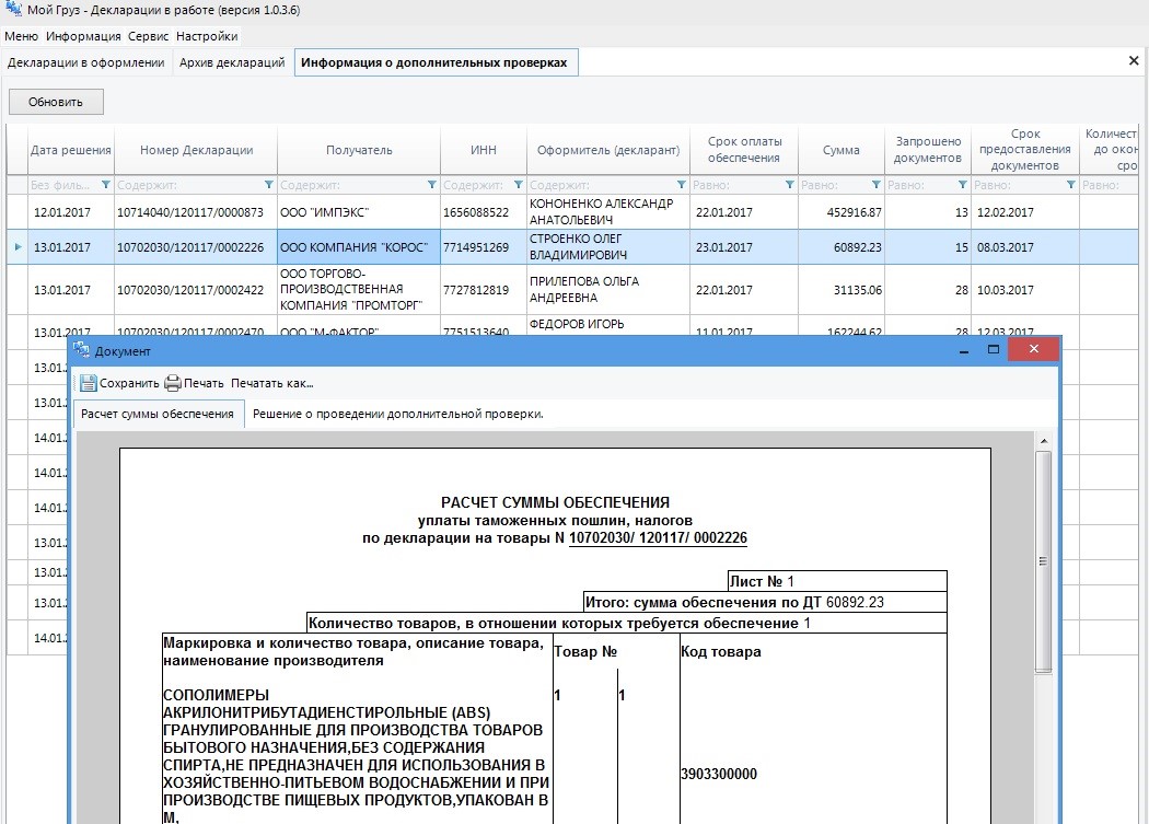 Клиентская часть программы представляет собой список из строк, в котором каждая строка - информация о декларации: номер ДТ, информация, характеризующая ДТ (отправитель, получатель, товар), текущее состояние процесса оформления ДТ, дата последнего статуса, имя инспектора, который работает с ДТ и т.д. Порядок столбцов с нужной информацией настраивается.