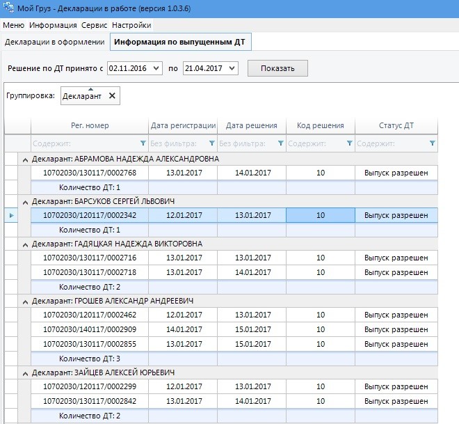 - Построение отчета по выпущенным ДТ с возможностью группировки по декларантам за заданный промежуток времени;